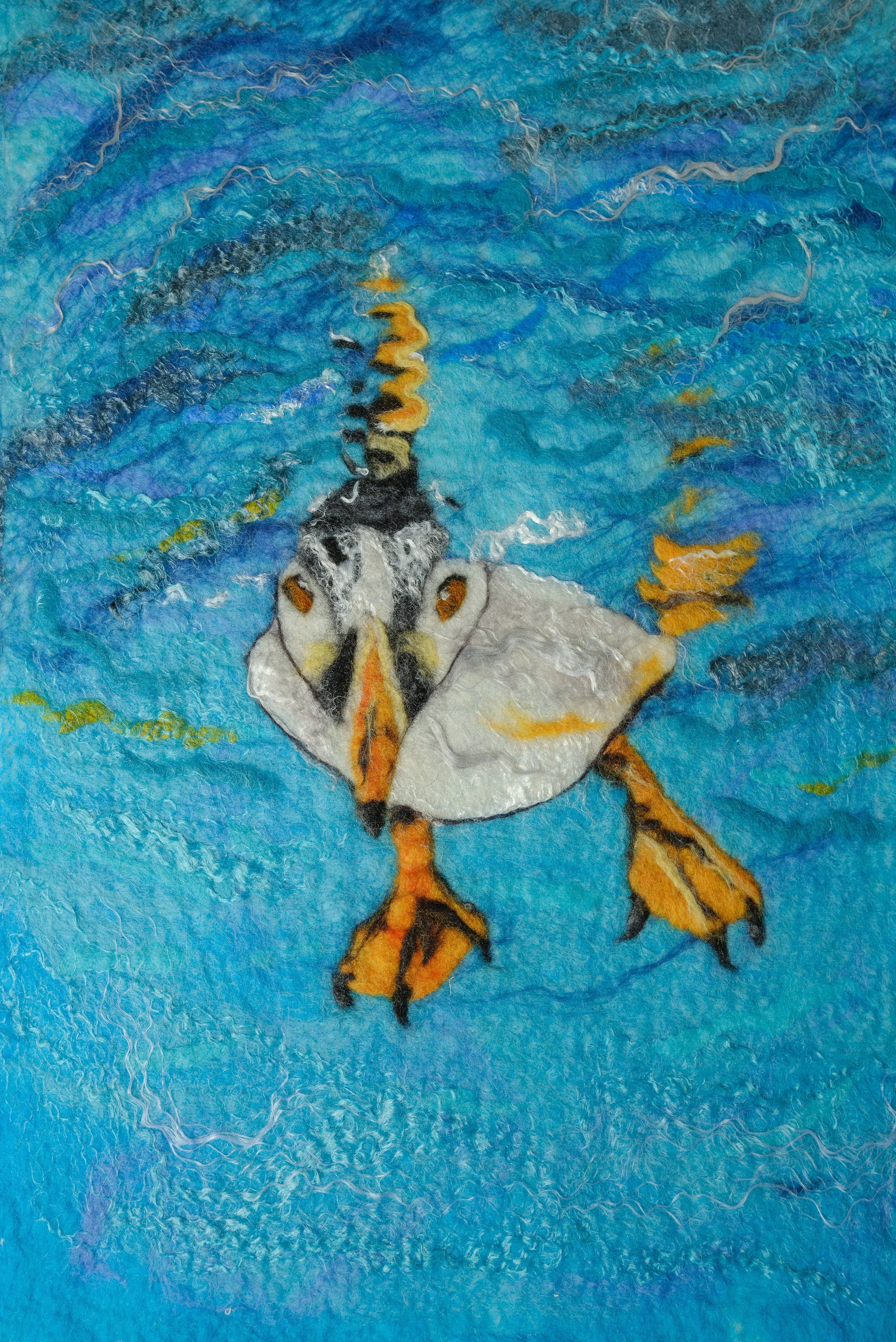 Anne has put together the imagery to match the words of Claire’s book using a mixture of wet felt and dry needle felting, to produce an array of textures and scenery that show the journey of the young puffin on his way home.